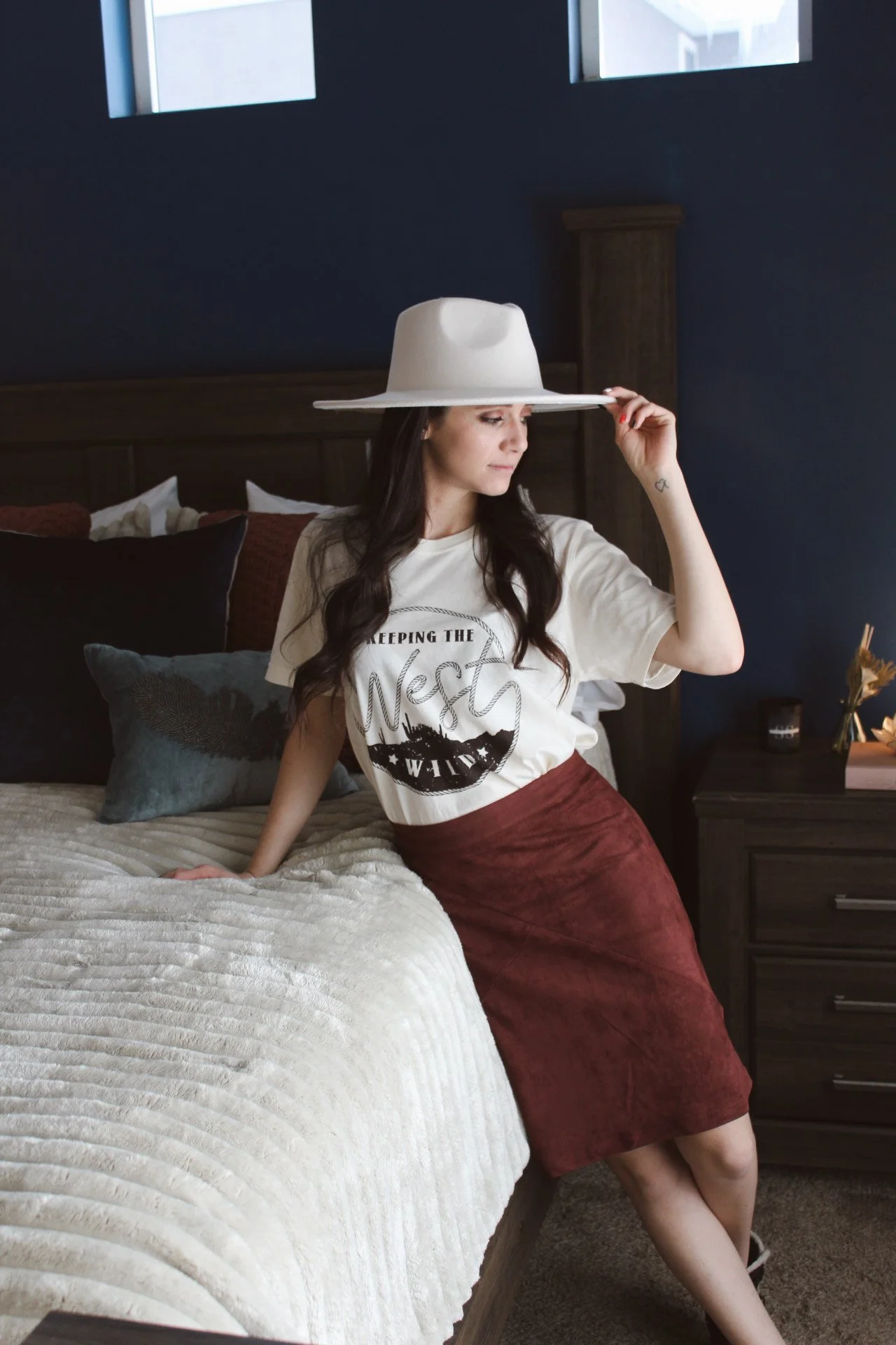 As local girls to rural Utah, we firmly believe in keeping the Wild West, Wild! Let your wild side out with this classic tee. This western inspired graphic tee features a relaxed fit, and a vintage off white wash. Pair this edgy & western tee together with the Rusty Cage Suede Skirt. Our suede skirt is elegant and will show off your gorgeous curves. This skirt is just as comfortable as it is beautiful and elevates any outfit. These two pieces together make such an edgy statement and bring out the western girl in us all. Leave the outfit as is or add the Traveler Blazer for a more sophisticated look or top with the Randi Hat to fully embrace the wild west.