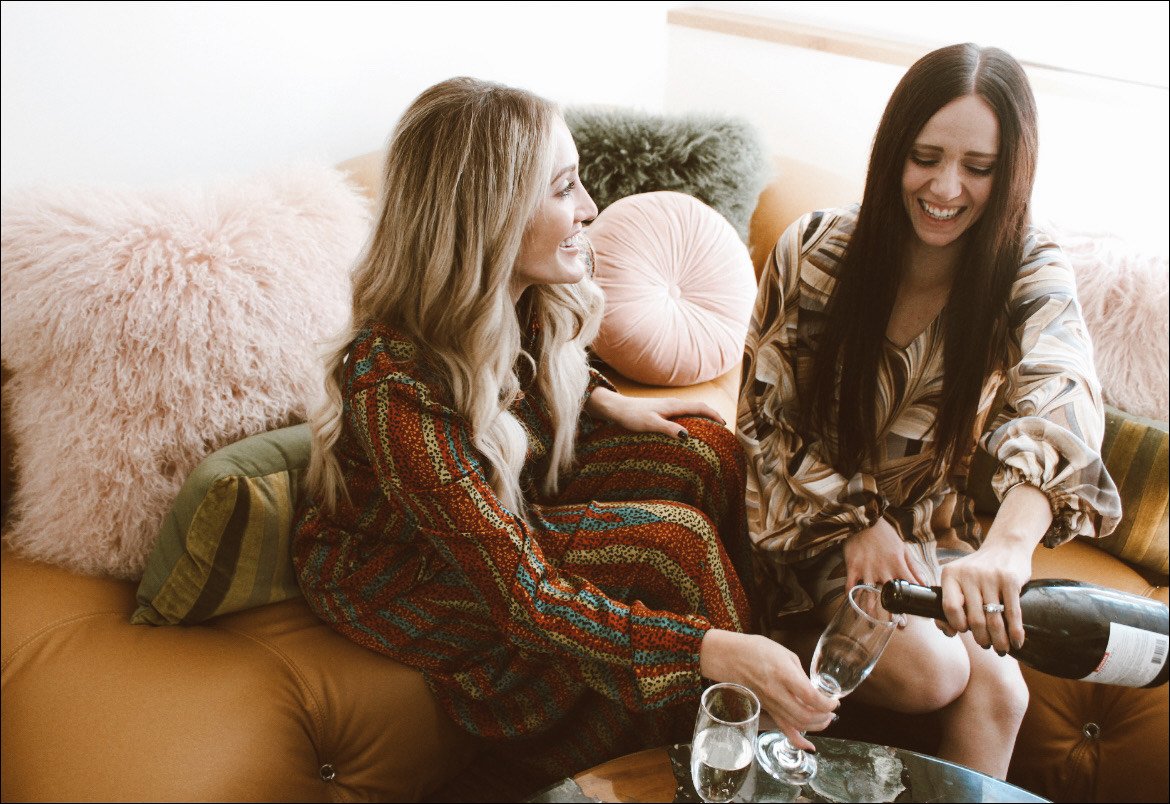 Not only was this a staycation with my ride or dies but it was a Suede + Smoke retreat. How can you not be inspired when surrounded by the changing leaves, vast mountains and the beautiful architecture Park City homes have to offer? We wanted to unwind, plan future events and collections, and create new content for you. The home we were staying in for the weekend was an interior designer’s dream. Each room contained unique design elements and were bright + colorful. We decided to take advantage of the beautiful space and do a mini photoshoot to showcase some of our pieces from the fall collection. The living room was 70’s chic and was the perfect aesthetic to showcase our Soul Sister Set, Zion Dress, Traveler Blazer, Paint the Town Blouse. and Cotton Candy Pink Always on My Mind top. Then just a quick step out onto the back deck and we were immersed in the cozy mountain forest - the perfect backdrop for our Sundance Sweater, Mocha Morning Top and Charlotte.